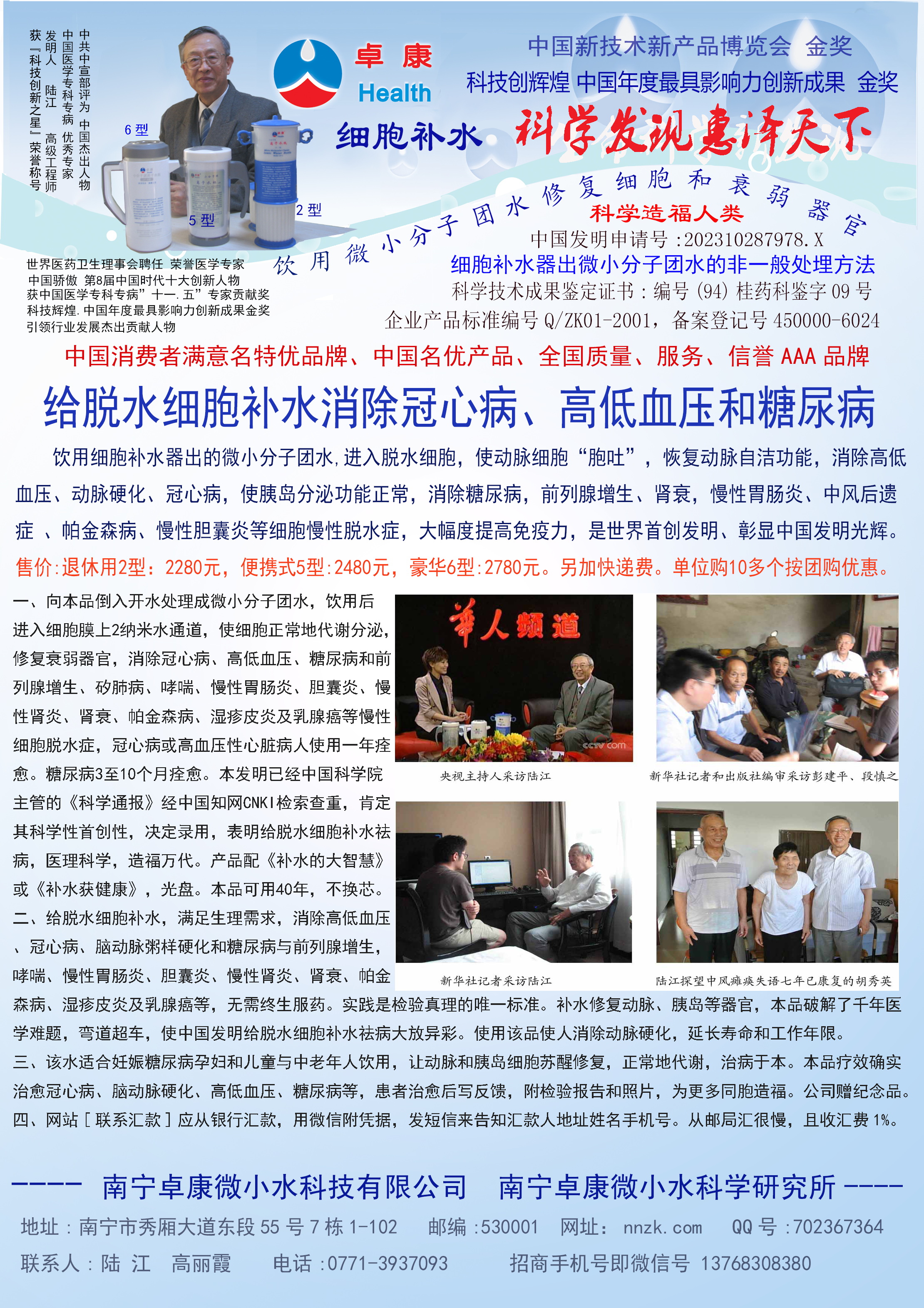 人類幾千年來患以上病癥需終生服藥,幾十年也不能治愈。可是我國南寧的高級工程師陸 江,于1990年想根治高血壓,研究發明了離子水瓶,處理出微小分子團水供飲用,經過醫院臨床試用和專家鑒定,1999年獲中國發明專利權,產品于2000年投放市場后一直跟蹤調查,據全國各地用戶反饋:祛除了高低血壓、糖尿病和冠心病,并使前列腺增生、咽喉炎、鼻竇炎、慢性氣管炎、支氣管炎、矽肺病、哮喘、慢性胃炎、腸炎、慢性膽囊炎、慢性腎炎、腎衰、膀胱炎、便秘、痔瘡、風濕性關節炎和濕疹皮炎及中風后遺癥等病癥不藥而愈。為什么喝微小水能治20多種?。筷?nbsp;江從1991年德國科學家發現細胞膜水通道僅為2納米獲得啟發,認為多種器官患病是因細胞脫水,不能正常代謝和分裂增殖,才使器官細胞減少致衰弱萎縮而形成細胞缺水性病癥。22年來的實踐有力地支持了“細胞脫水致病”這一重要論點,表明喝微小水可滿足細胞的生理需求,補水就能祛病,是生命科學新亮點。